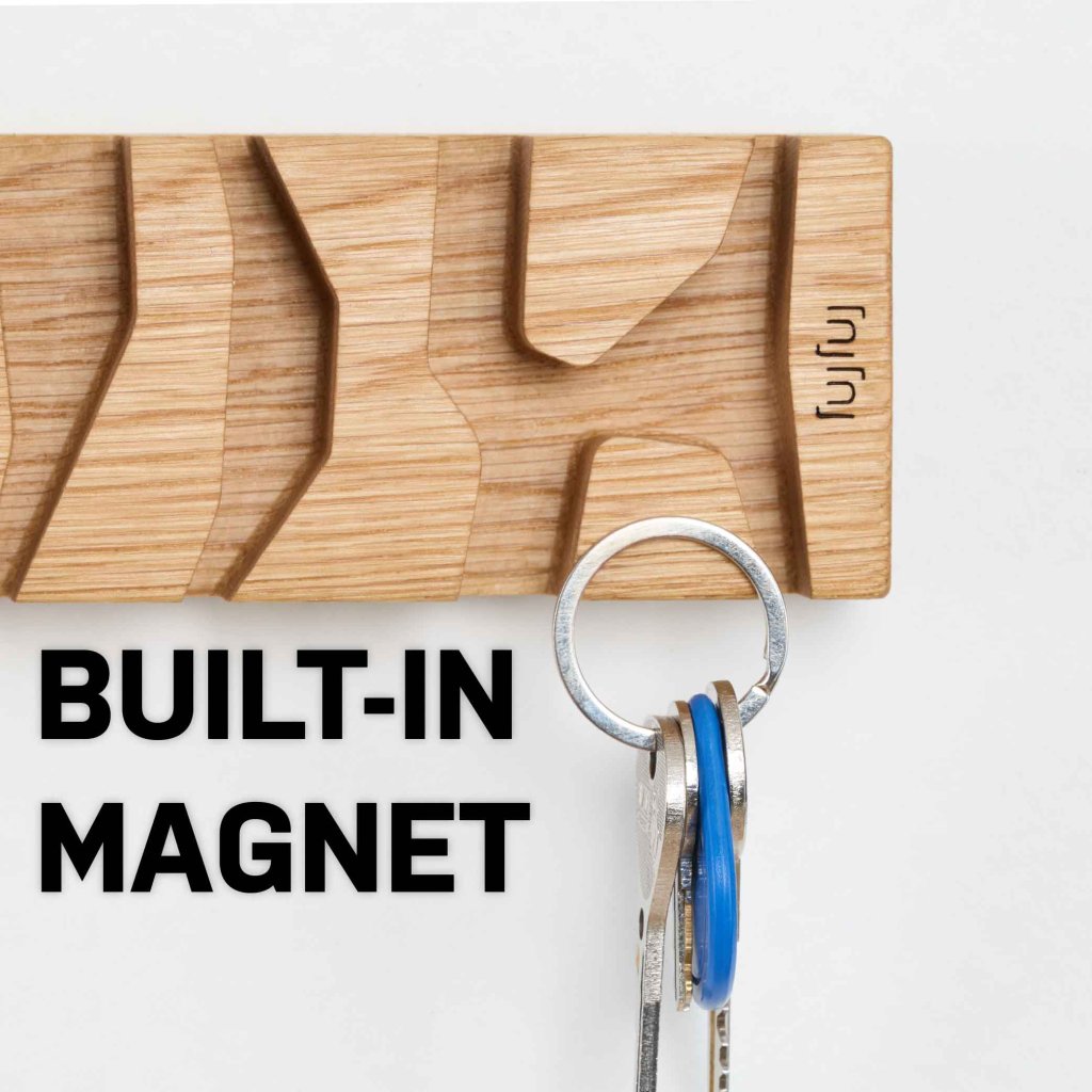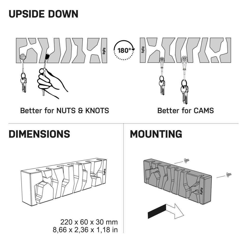 A minimalist key holder made from local oak wood. It features 7 cracks inspired by real rock lines, designed to hold Fujfuj keychains (3 Nut or Knot Keychains included). In its standard position, it’s optimized for holding nut, hex, and knot keychains, but when turned upside down, the cracks become wider—perfect for cam keychains. An integrated magnet lets you hang borrowed or extra keys without a climbing keychain. Easy installation with screws.